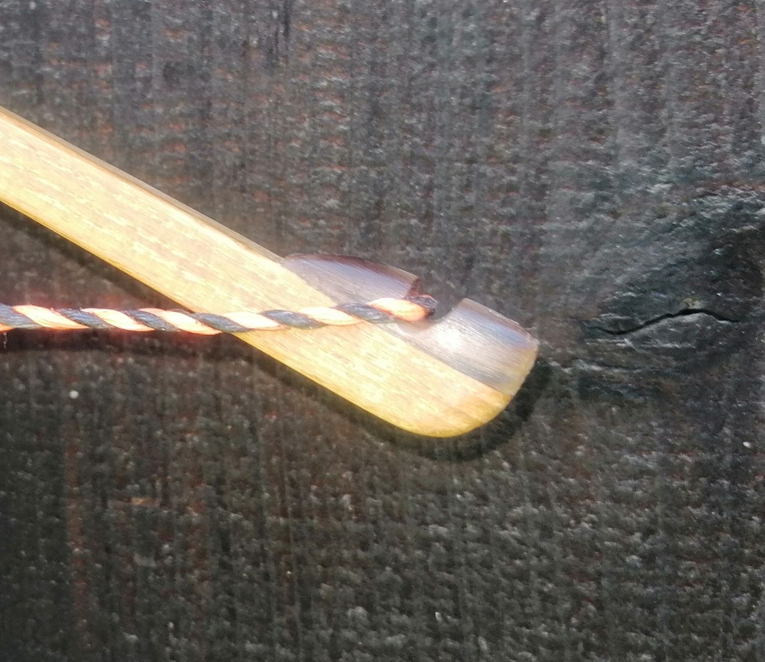 Diese Eibe war im Rohling etwas "rustikaler" und außerdem war am oberen Wurfarm ein etwas zu großer Ast im Splint. Obwohl es ein riesiger Aufwand ist, war mir diese Eibe die Arbeit wert, eine Sehnenschicht aus Tiersehnen aufzubringen.