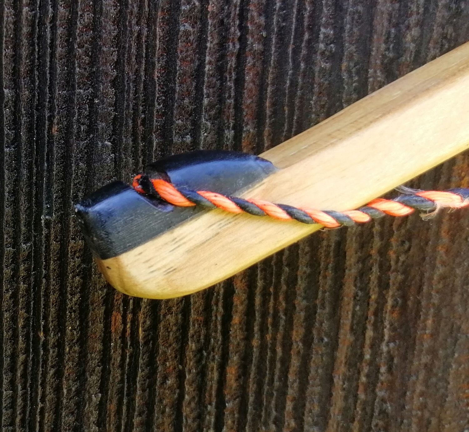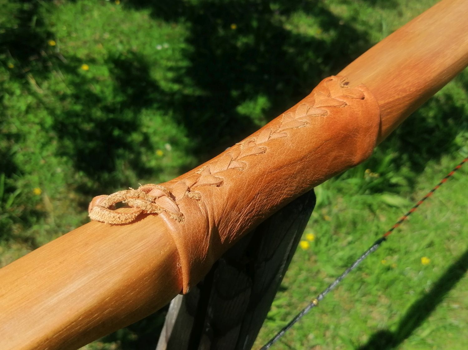 In diesem speziellen Fall wurden Fußsehnen vom Strauß mit Hautleim aufgeklebt. Die Sehnenschicht verhindert einen Bruch im Splint und außerdem bringt sie durch ihre Elastizität noch ein bisschen mehr Zuggewicht.