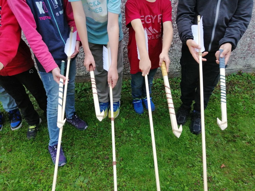 Auch heute gibt es noch Spezialisten, die Feuersteine perfekt schlagen können. Solche Feuersteinklingen wollen wir zu Messern verarbeiten. Jeder Teilnehmer bekommt einen kleinen Haselstab. Mit Hilfe von Feuersteinabschlägen versuchen wir, eine passende Kerbe in den Haselstab zu schnitzen. In diese Kerbe soll die spezielle Klinge eingeklebt werden.
