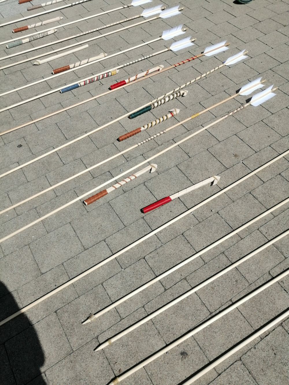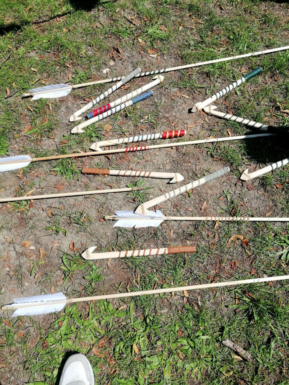 Neben der Schleuder bekommt der Teilnehmer einen Speer im Rohzustand, bei dem die Federn schon geklebt sind. Der Speer muss durch Hanfwicklungen an den Federn und an den Enden vervollständigt werden.