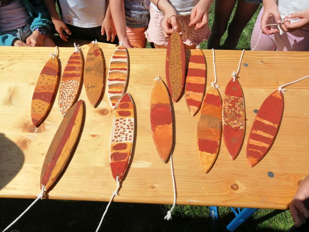 Jeder Teilnehmer des Workshops erhält ein vorgefertigtes Schwirrholz inkl. Schnur. Die Schwirrhölzer werden mit Naturpigmenten angemalt. Es werden 4 verschiedene Farben zur Verfügung gestellt. (Ocker, Orangeocker, Rotocker und Umbra(Braunton)) Natürlich mussten Steinzeitmenschen die in der Natur gefundenen Farbpigmente in einer Flüssigkeit lösen, um damit malen zu können. Wasser allein ist relativ ungeeignet, da die Farben anschließend ganz leicht wieder abgehen.